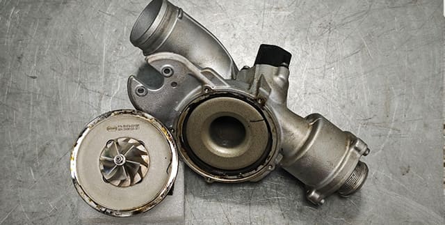 Корпус компрессора («холодная улитка») формирует поток воздуха на стороне впуска. Несмотря на меньшие тепловые нагрузки по сравнению с «горячей» частью, корпус нередко получает механические повреждения. Замена корпуса турбины требуется, например, при попадании посторонних предметов во впускной тракт (части фильтра, мусор, песок), а также при повреждениях посадочных поверхностей.